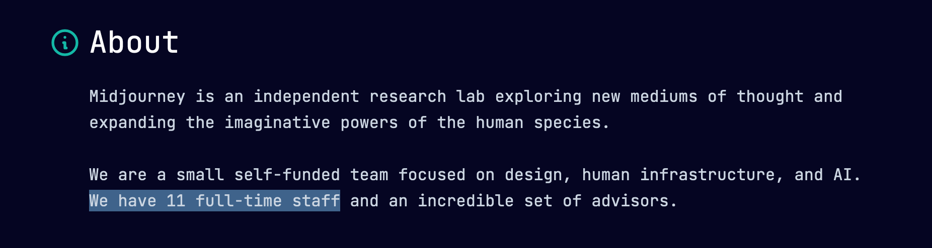 Midjourney, the AI-powered image generation organization, is the poster child of this trend. Despite its outsized influence and impact, it currently employs 11 full time employees and is self-funded.