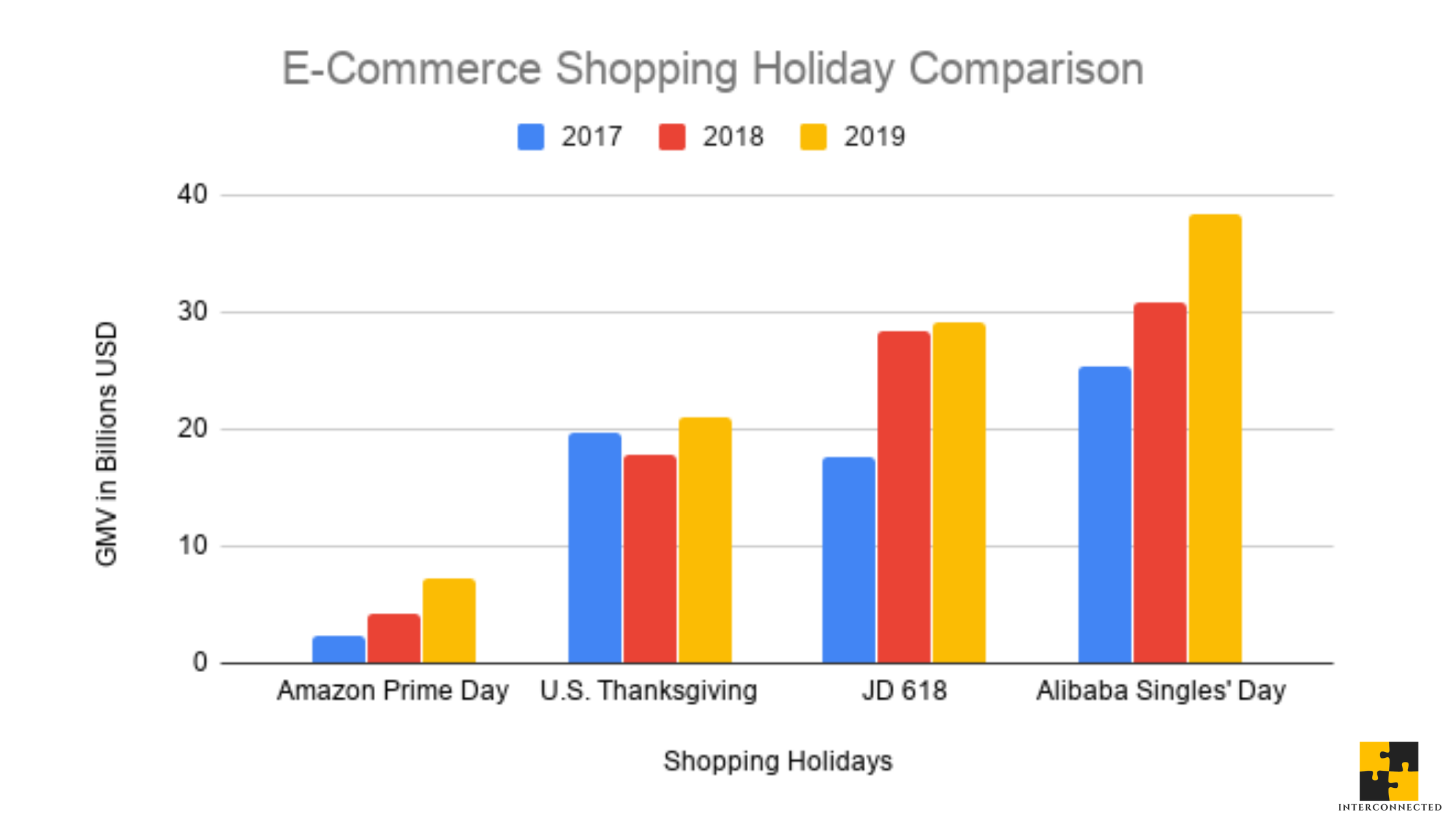 A few things to keep in mind as you look at these numbers: the GMV volumes for 618 and Singles Day reflected in this chart are by the original creator of that holiday, i.e. JD.com for 618 and Alibaba for Singles’ Day. Thus, it’s not a full picture of the entire GMV volume that was generated on those days. I did this because these shopping holidays, which used to be driven just by the company that created it, are now national events where almost every company participates, thus tracking the total volume gets a bit messy. For example, during the most recent 2020 618, the first shopping holiday since the coronavirus outbreak, JD.com pulled in $38 billion USD and Alibaba pulled in $98 billion USD for a total of $136 billion USD just between those two platforms. That total certainly does not include new e-commerce upstarts, like Pinduoduo and Little Red Book. As for “U.S. Thanksgiving”, it’s the combined online shopping volume of three days: Thanksgiving Day, Black Friday, and Cyber Monday, across all retailers big and small.