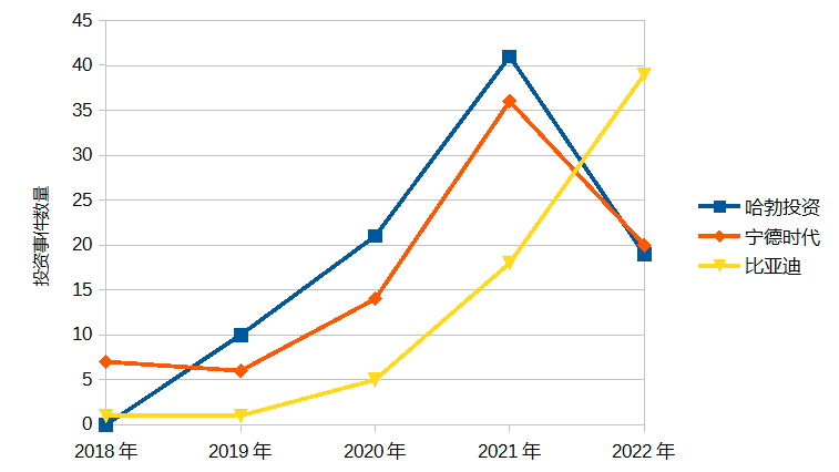 Habo has only gotten busier since. And not only Habo, but also the corporate venture arms of two other “national champions” – CATL and BYD. Here’s a chart of Huawei, CATL, and BYD’s respective corporate VCs’ deal volume in the last five years, courtesy of CVSource. Since 2018, Habo (blue) has made 90+ investments, CATL (orange) has made 80+, and BYD (yellow) has made 65+. The pace of investment from all three has picked up since 2020 and has continued unabated.