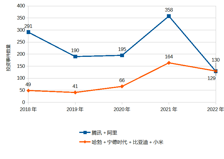 Alibaba and Tencent’s combined investment deal volume (blue) has fallen to about the same level as the combined volume of Habo, CATL, BYD, and Xiaomi (orange). (The smartphone maker is another active corporate VC in the “hardtech” realm, though it has investments in Internet companies too.)
