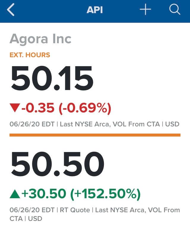 我的想法: 被许多科技人士称为是“中国的Twilio”的声网Agora本周在NASDAQ成功IPO,对所有关于中美科技界和资本市场各种脱钩的舆论唱了个反调。(借此机会也赞赏一下Agora团队注册到了21世纪经济最好的股票代码,API。)股票上市第一天暴涨了150%,而每看到上市公司首日暴涨我总是会想起Box CEO Aaron Levie的一句名言: