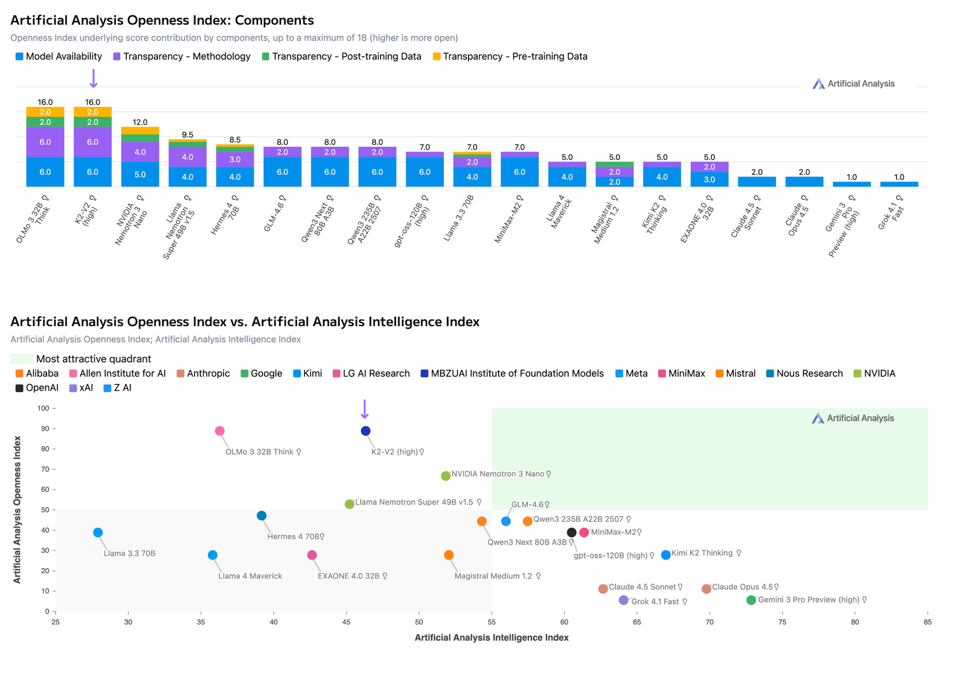 Right now, the top three models in the world in terms of openness comes from NVIDIA (Nemotron 3), the Allen Institute (Olmo 3), and the Mohamed bin Zayed University of Artificial Intelligence (K2-V2), according to Artificial Analysis: