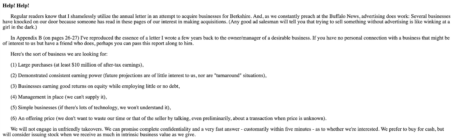 One of the “superpowers” of Buffett’s success is his ability as a consummate but tasteful marketer, using his annual letters as a vehicle to advertise Berkshire in order to acquire more businesses. He was a pioneer in the “newsletter as a distribution channel” tactic, long before any of us. Here is a screenshot from his 1990 annual letter: