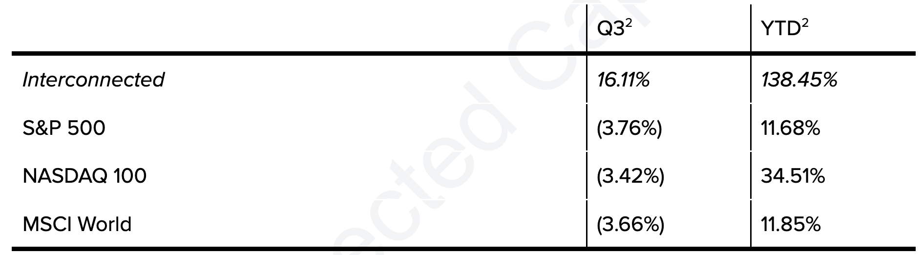 All figures are unaudited. Interconnected does not undertake to update any information contained herein as a result of audit adjustments or other corrections. Past performance is not indicative of future results.