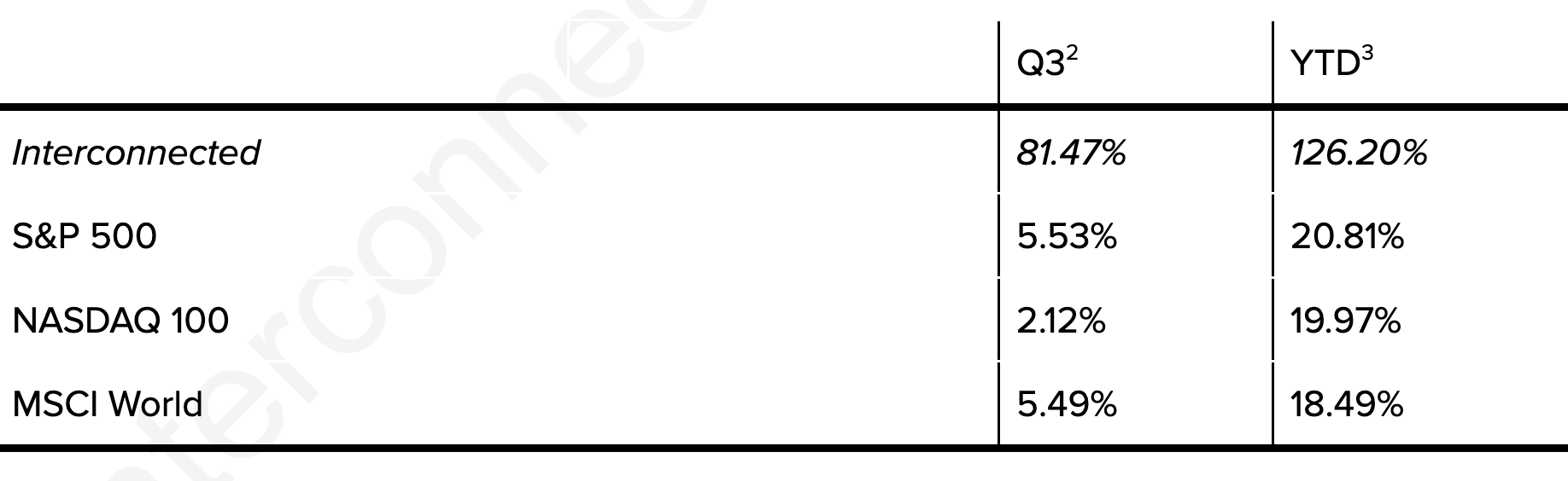 All figures are unaudited. Interconnected does not undertake to update any information contained herein as a result of audit adjustments or other corrections. Past performance is not indicative of future results.
